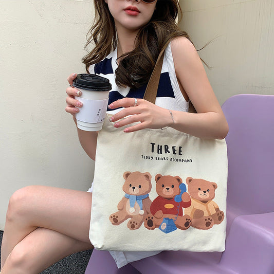 Cute Bear Printed Canvas Bag Women All-match Shoulder Bags Student Large Capacity Daily Handbags