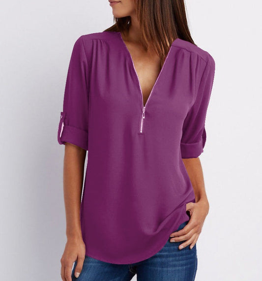 Zip V-neck Shirts Women Short Sleeve Loose Tops